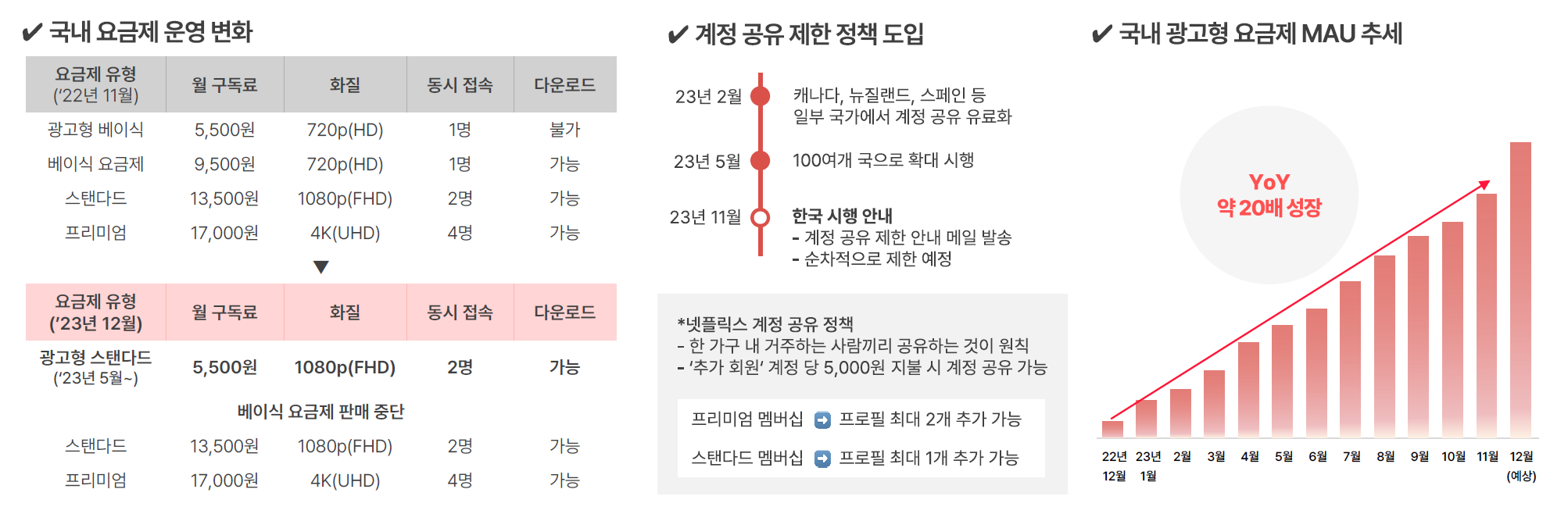 - 넷플릭스는 국내에서 계정 공유 유료화 정책을 본격적으로 시작하고 국내 베이직 요금제를 폐지하는 등