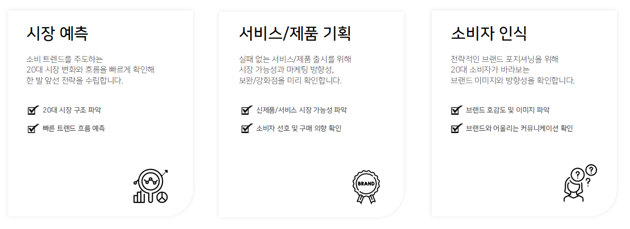 : 국내 최대 대학생 보이스로 성공적인 국내 시장 전략을 만드는 20대 전문 리서치 서비스 입니다.
