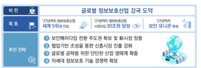 • 2027년까지 정보보호산업 시장규모 30조원 달성, 보안유니콘 육성 등을 목표로 4대 전략과 13개 과제를 추진.