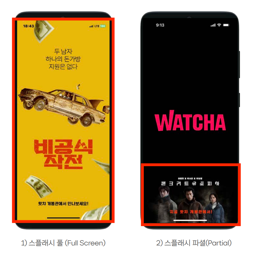 | 노출지면 | 1) 풀 (앱 진행 시 전체 화면 노출) 2) 파셜 (앱 진행 시 화면 하단 노출) * 두 영역 중 한 곳만 노출 가능 |