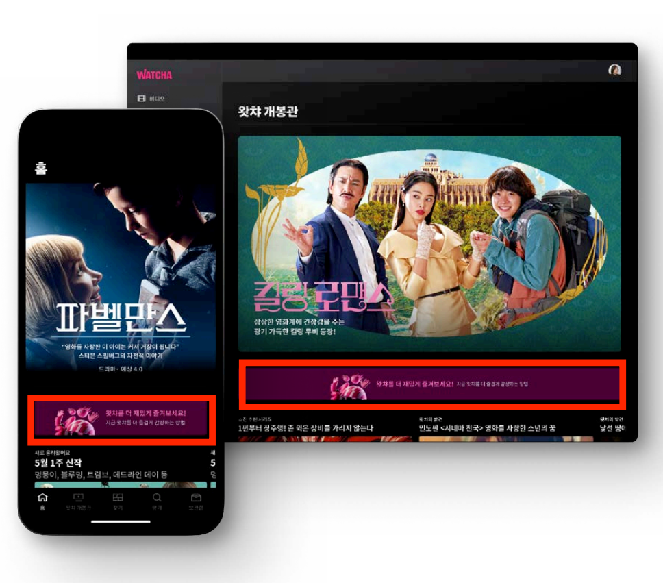 왓챠는 사용자 맞춤형 추천을 통해, 시청한 콘텐츠를 바탕으로 개인화된 콘텐츠를 지속적으로 제시합니다.