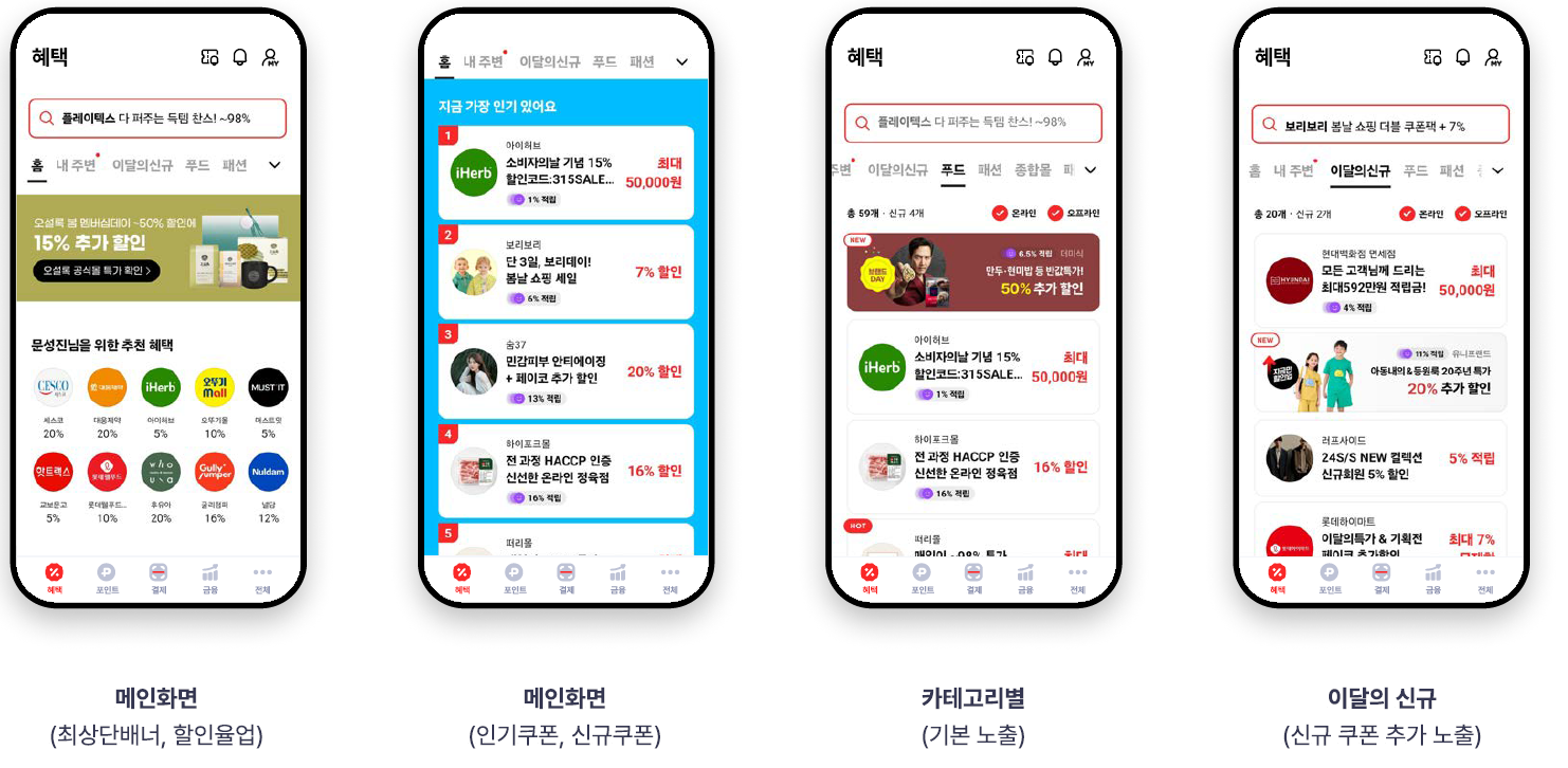 | 광고노출 | - 타케팅 가능 (관심자, 디타켓) - 쿠폰배너 진행시 : 이벤트 페이지 or 아웃링크 (선택) |