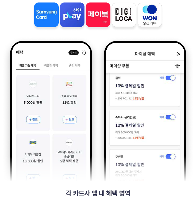 | 광고노출 | - 각 카드사 앱 혜택영역 (신한, 비씨, 삼성, 롯데, 우리) - 카드사 사정에 따라 매월 노출 여부 결정 |