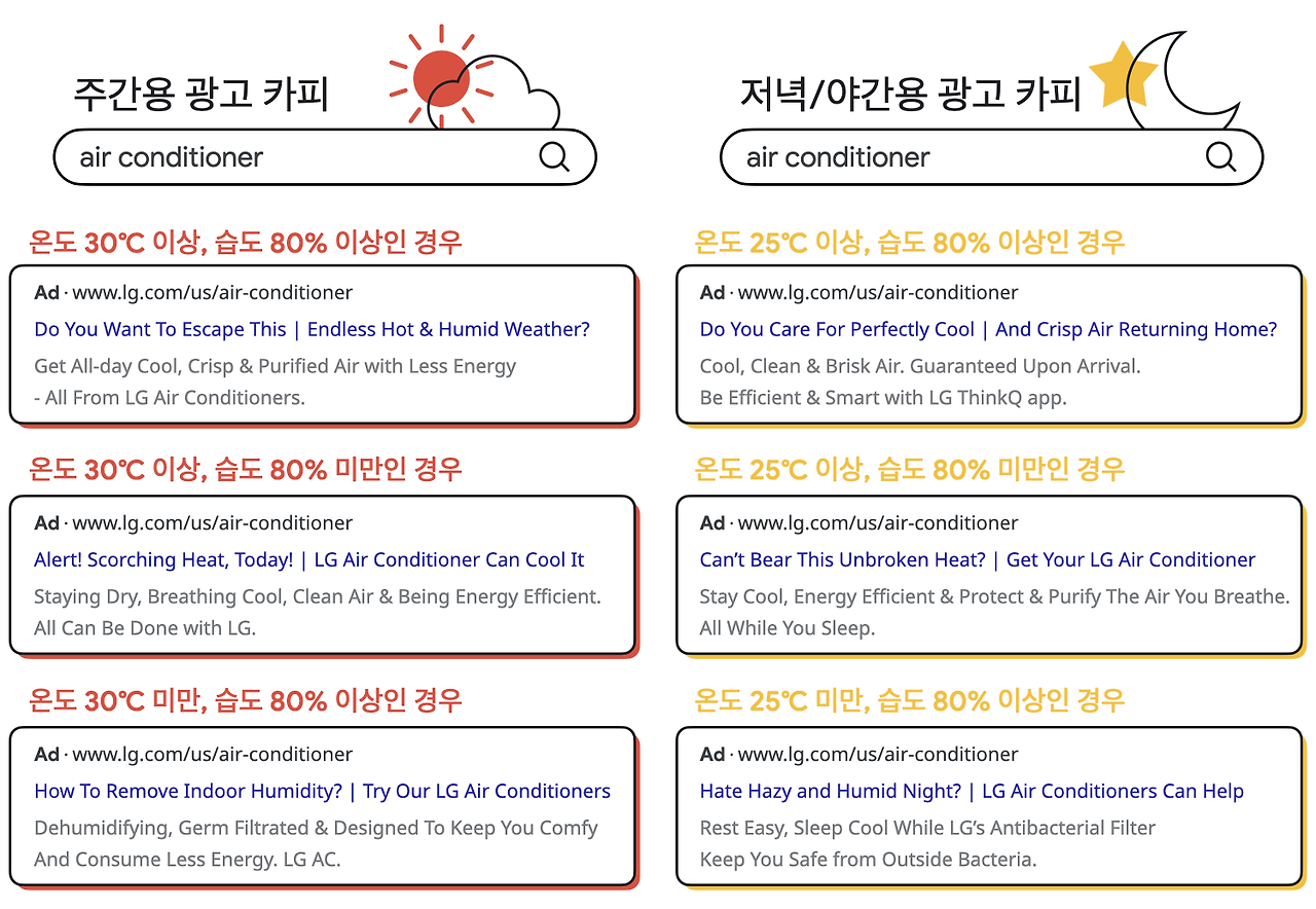 다만 온도, 습도, 시간 등 날씨 조건을 세분화한다고 해서 반드시 광고 반응률이나 WTB 전환율이 우수한 것은 아니며, 한 국가 내에서도 어느 지역(City Level)에 위치하는가에 따라 광고 카피에 대한 반응률이 다르기 때문에 캠페인을 실행하는 국가에 대한 높은 이해를 기반으로 캠페인이 설계 필요.