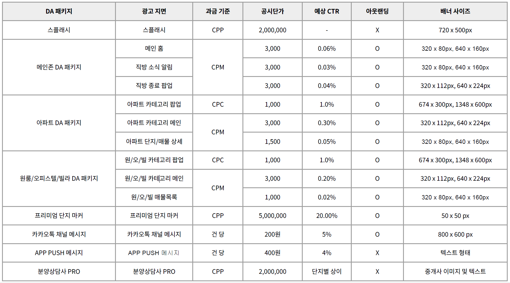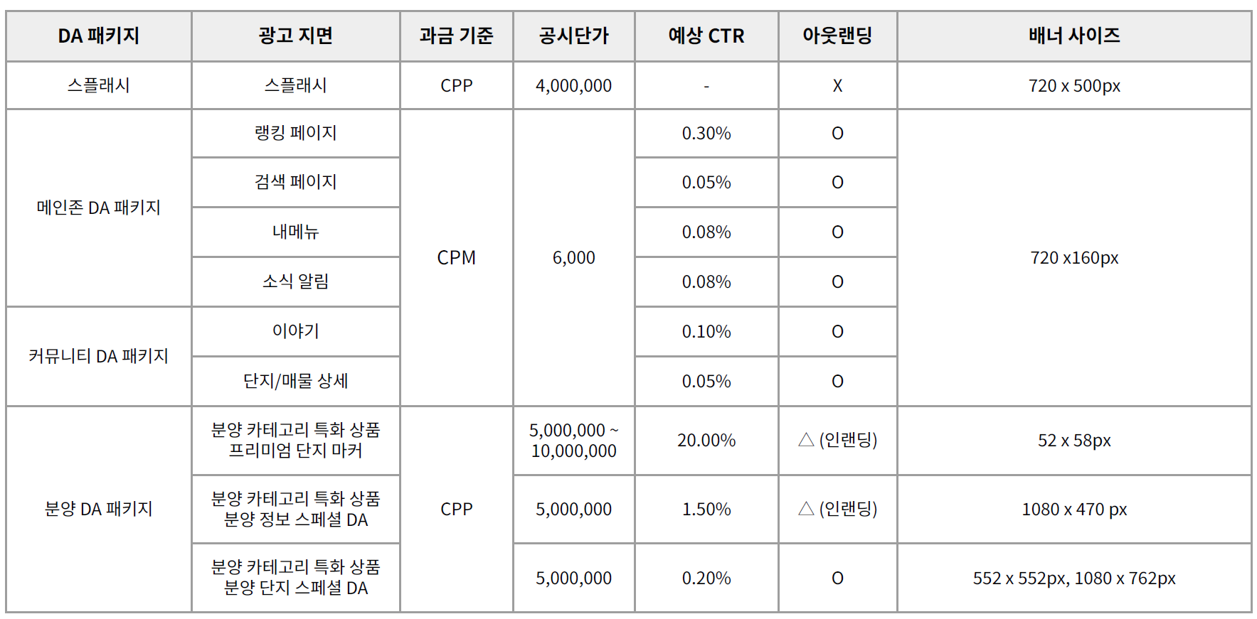 | 광고 지면 | 예상 CTR | 타겟팅 | 아웃랜딩 | 과금 기준 | 배너 사이즈 |