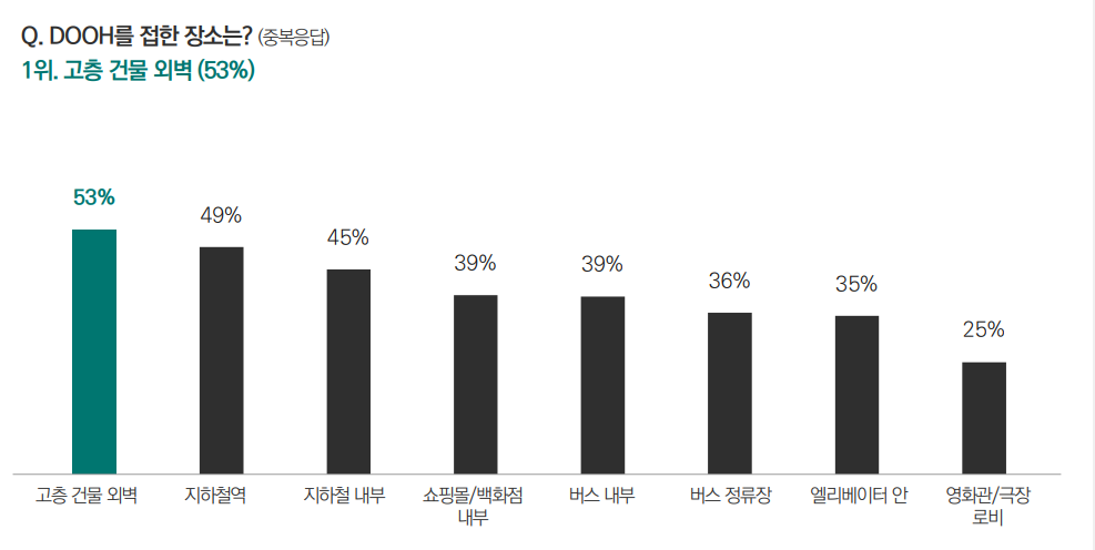 DOOH로 본 브랜드를 온라인(SNS, 포털)에서 다시 봤을 때 기억에 더 잘 남는다는 응답이 61%에 달했습니다. 즉, DOOH는 온라인 마케팅 성과를 뻥튀기해 주는 '강력한 부스터'인 셈입니다.