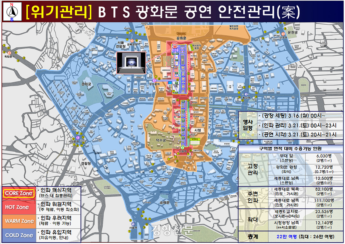 : 경찰은 현장을 코어존(무대 앞)부터 콜드존(외곽)까지 4단계로 나누어 인파를 관리합니다.