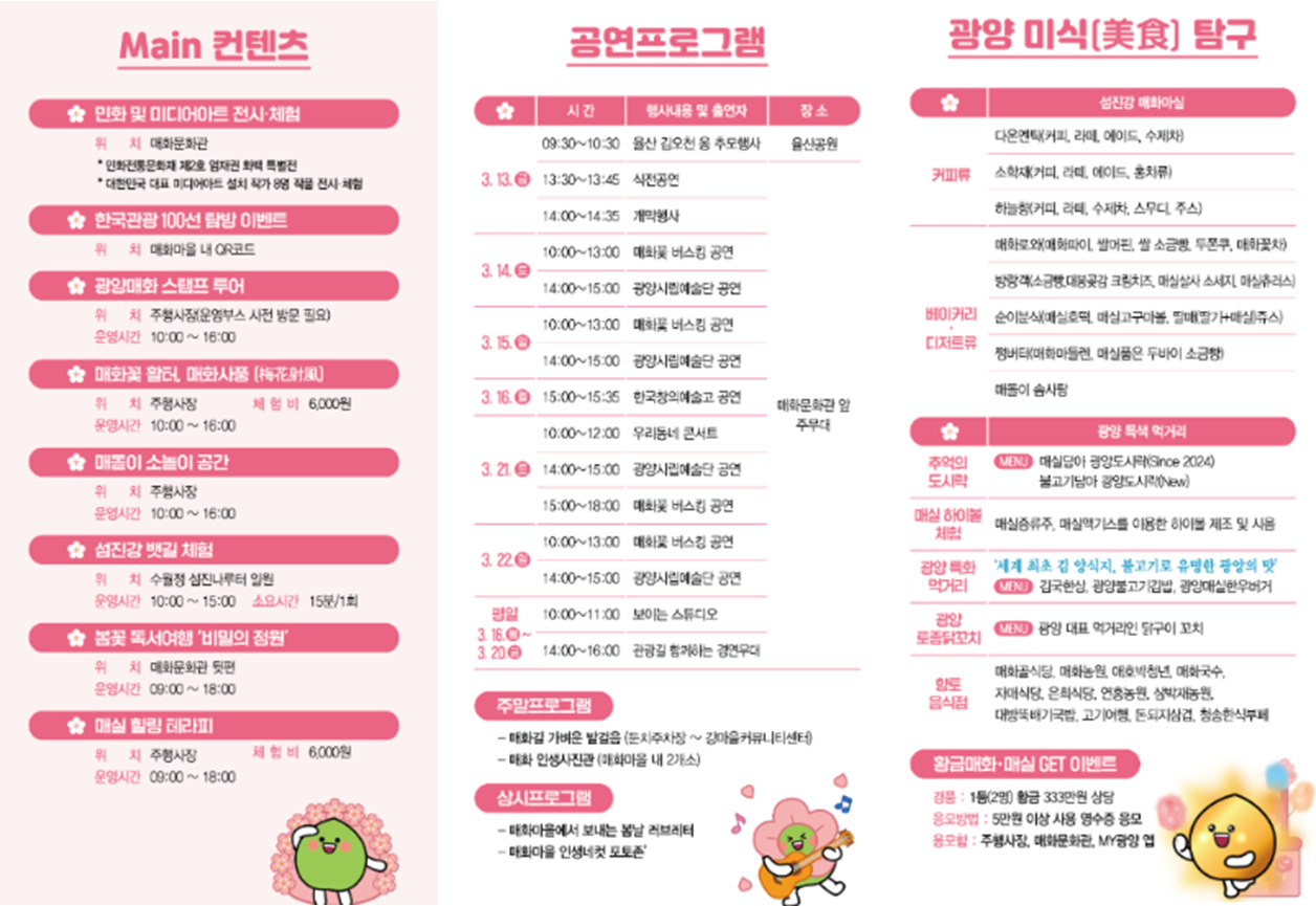 - 광양 매화 개막행사: 화려한 개막 공연과 함께 봄의 시작을 알립니다.