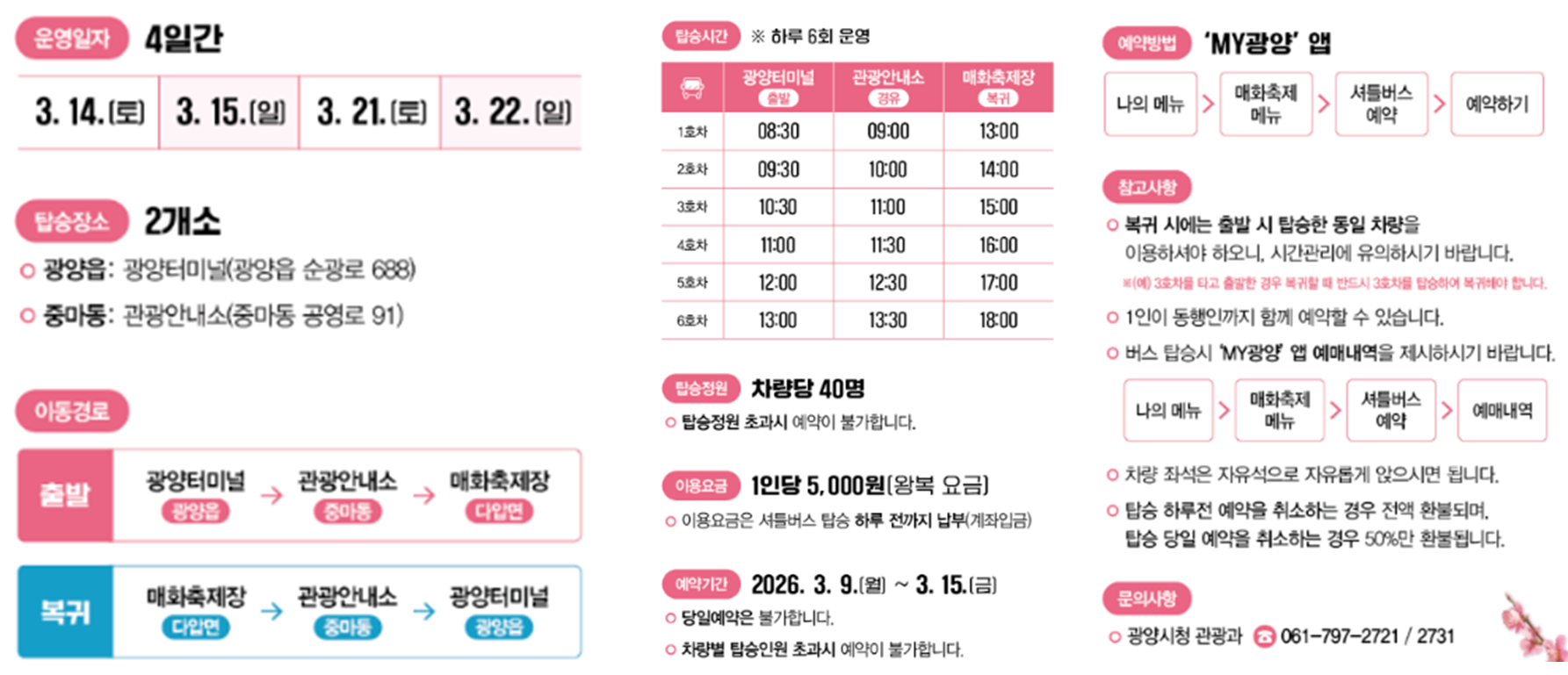 | 도심권 예약제 셔틀 | 광양 터미널 - 축제장 | - 주말 (3/14, 15.21.22) 동안 운영 - 노선 : 광양터미널 - 관광안내소 - 광양매화마을 - 요금 : 5천원 - 예약 : 마이광양 앱 |