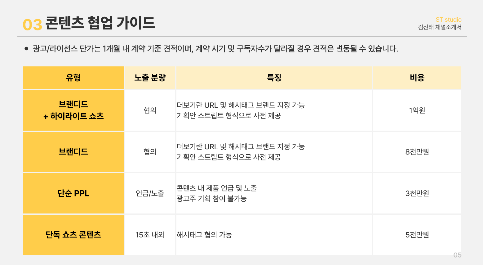 구독자 수 급증에 따라 소속사(또는 대행사)를 통해 공유되기 시작한 공식 광고 제안서를 입수했습니다.