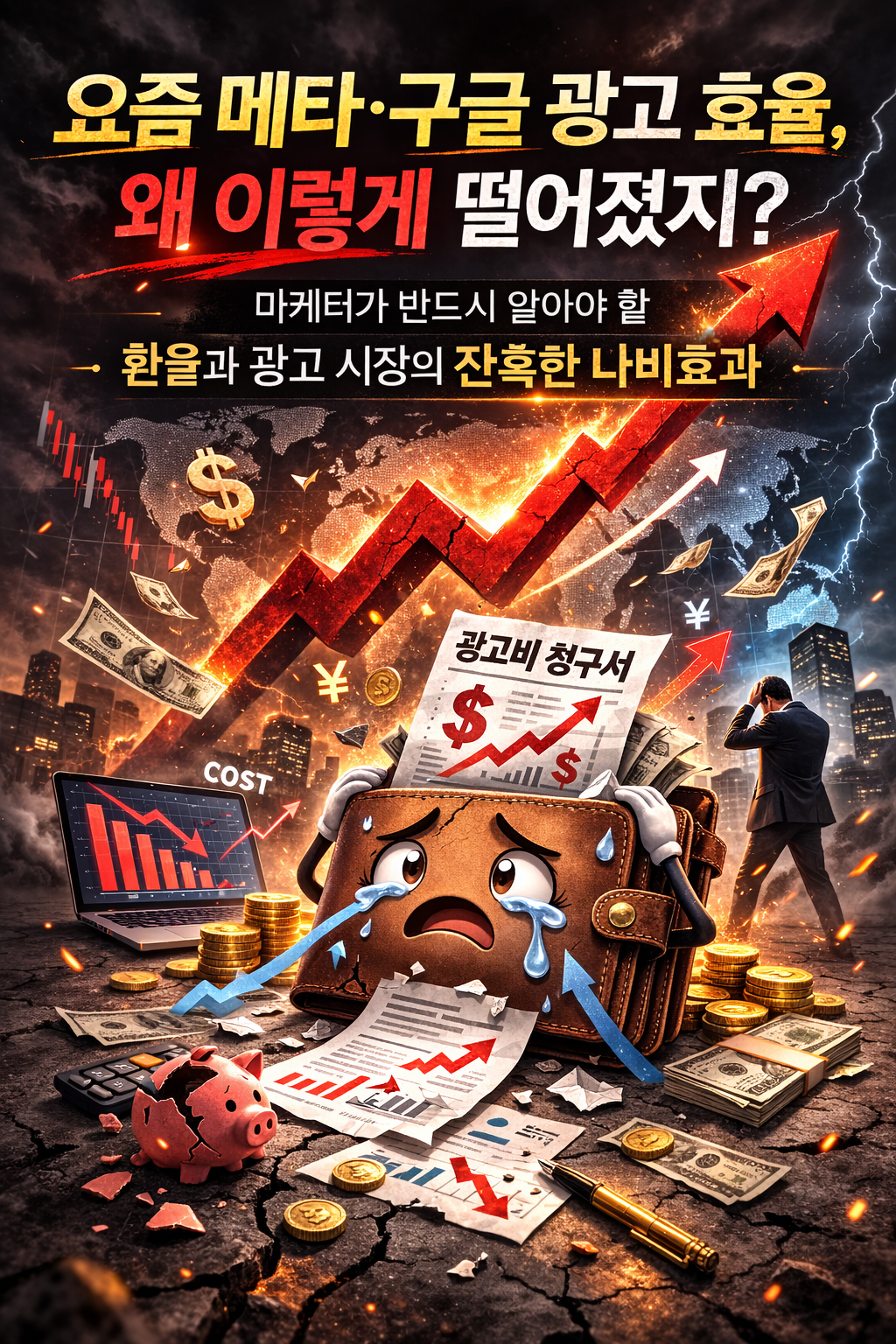 - 실질 단가 상승: 예산은 원화로 한정되어 있는데 환율이 오르면, 동일한 달러 예산을 소진하기 위해 더 많은 원화가 필요합니다. 즉, 체감상 클릭당 비용(CPC)이나 고객 획득 비용(CPA)이 10~20% 이상 훌쩍 뛰어오르는 현상이 발생합니다.